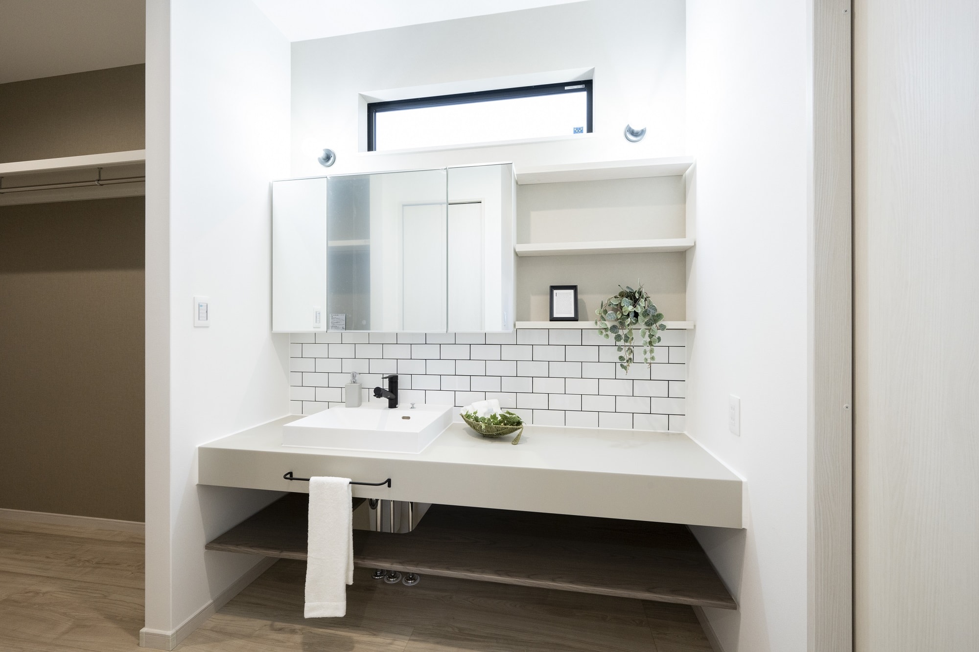 洗面室はワイドな鏡とカウンターで、横に並んで同時に使えるのもうれしいですね。