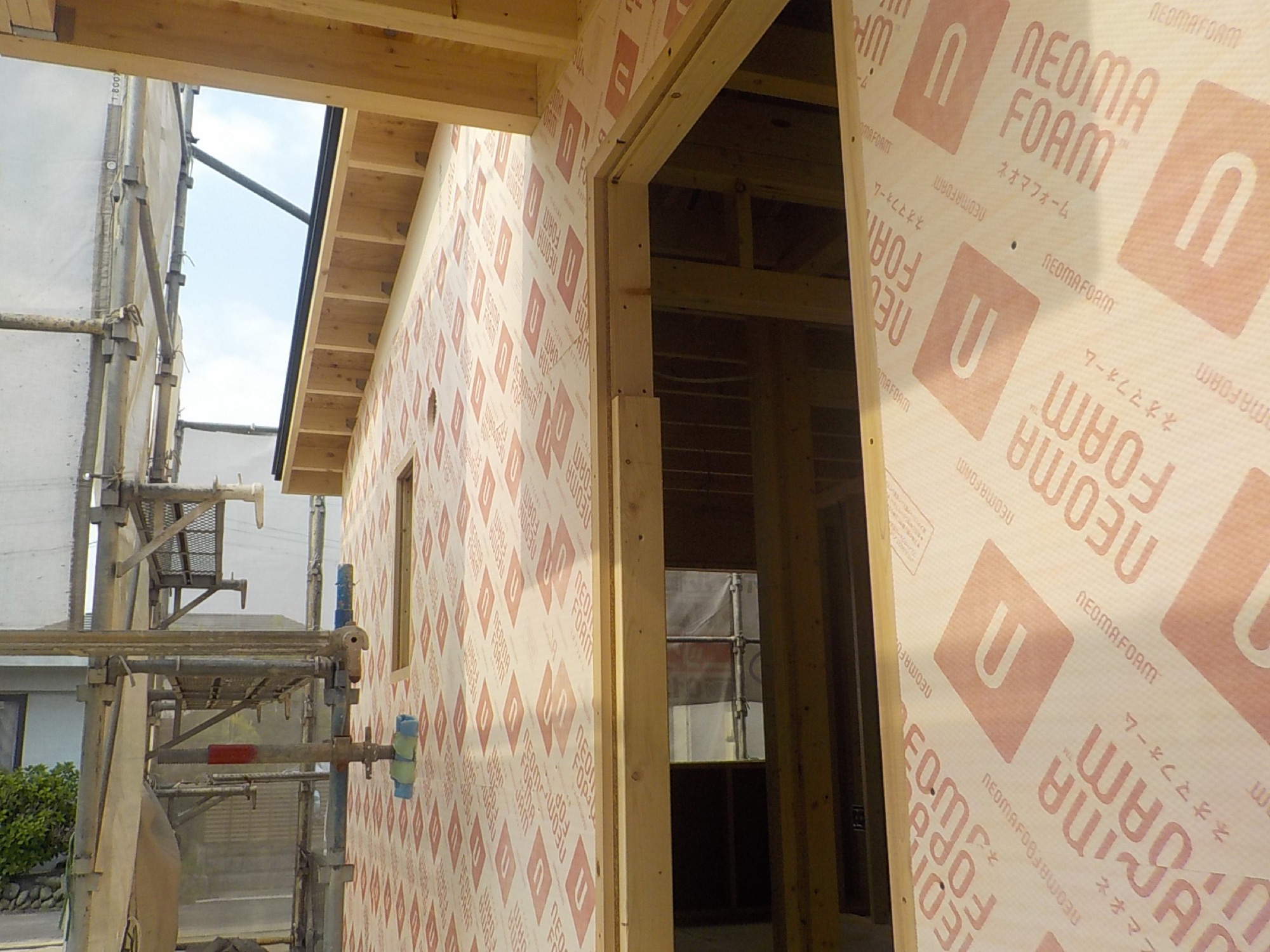 外張り断熱はフェノールフォームの「ネオマフォーム」。高断熱性能、長期断熱性能、耐燃焼性能、環境性能が特徴の断熱材で、こちらは長期性能も試験済。25年間の平均熱伝導率 0.020W/(m・K)を達成しています。