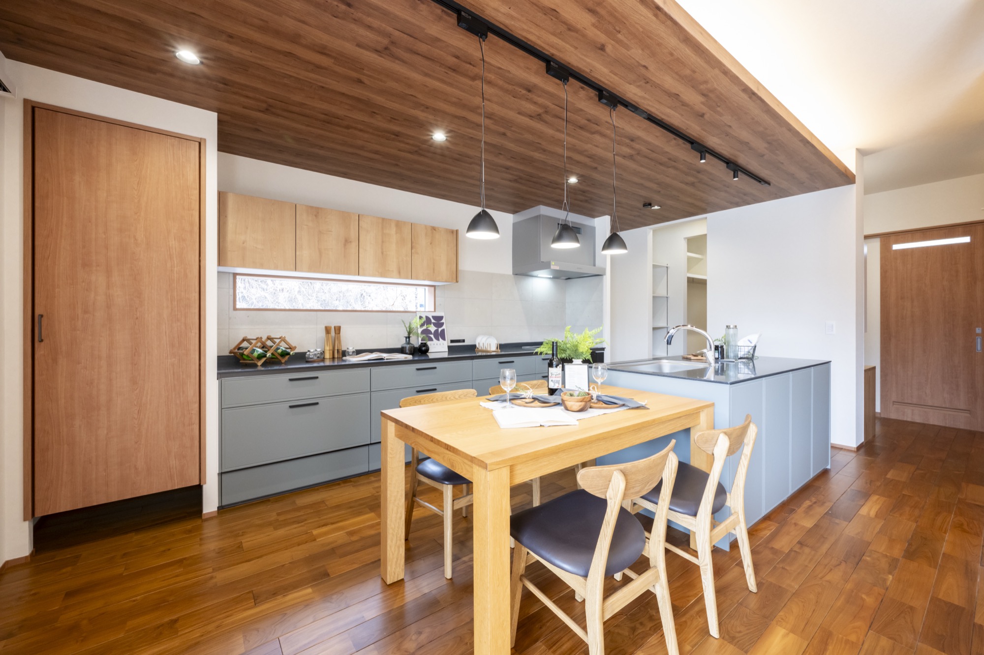 写真はナチュラルモダンを意識したお客様邸。床や天井、建具に木目を取り入れて木の温かみを感じられる上、ダイニングテーブルや収納も自然素材のさわやかな雰囲気に。一方、キッチンはグレー系のフラットデザインにすることで洗練された印象も与えます。テーマを意識して各ポイントをチョイスすることで、余計な装飾を加えることなく居心地のよい空間が実現します。