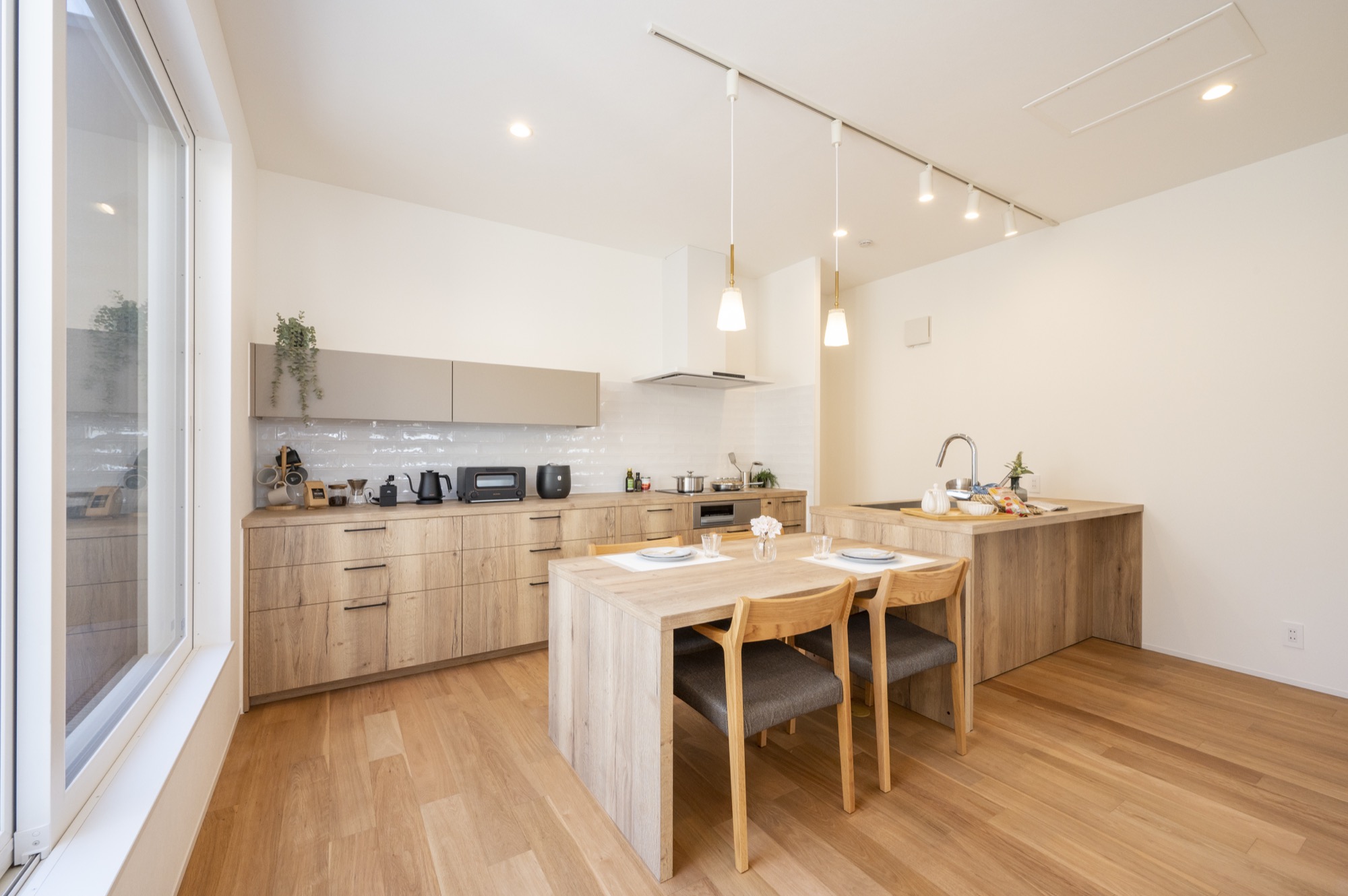こちらはよりナチュラルなスタイル。明るめの木目をベースにして、どこかやさしい雰囲気を演出しています。大きな窓から入る自然光とも相まって、さわやかで開放的なダイニングキッチンですね。