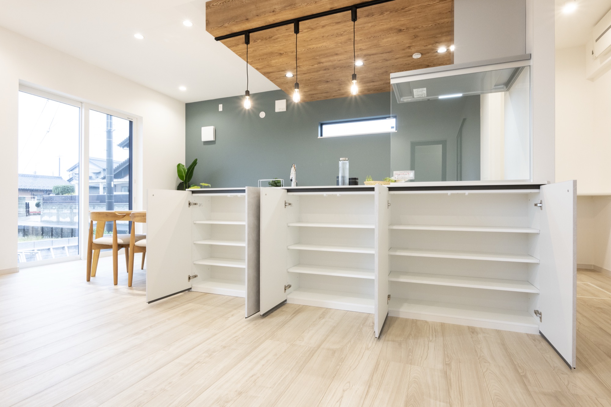 キッチンとダイニングは行き来が多いため、この間に収納があると動線も効率的になります。人気があるのはキッチンカウンター下の収納。限られたスペースを有効活用できるため、間取りに大きな影響を与えず実現できます。