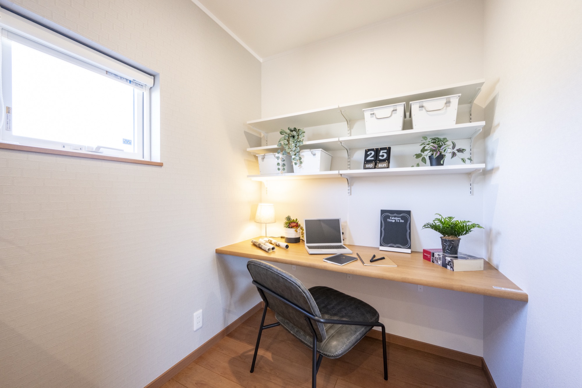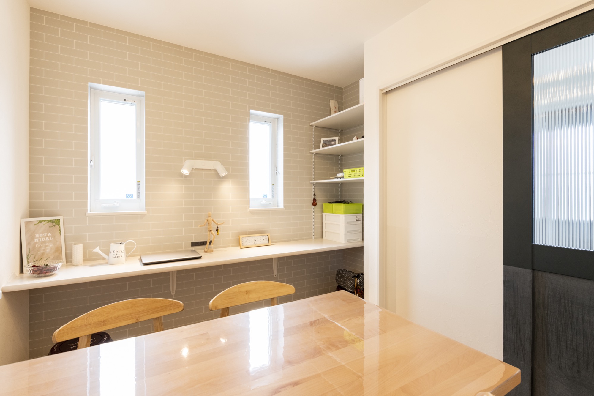 ダイニングに造作カウンターを設けるプランも増えています。お子さんの勉強用やワークスペースとして使えるカウンターですが、合わせて可動棚を取り付けるのがおすすめ。カウンターの用途に応じた収納となるのはもちろん、ダイニング収納として使えばテーブルの上などもすっきりと片づけやすくなるでしょう。