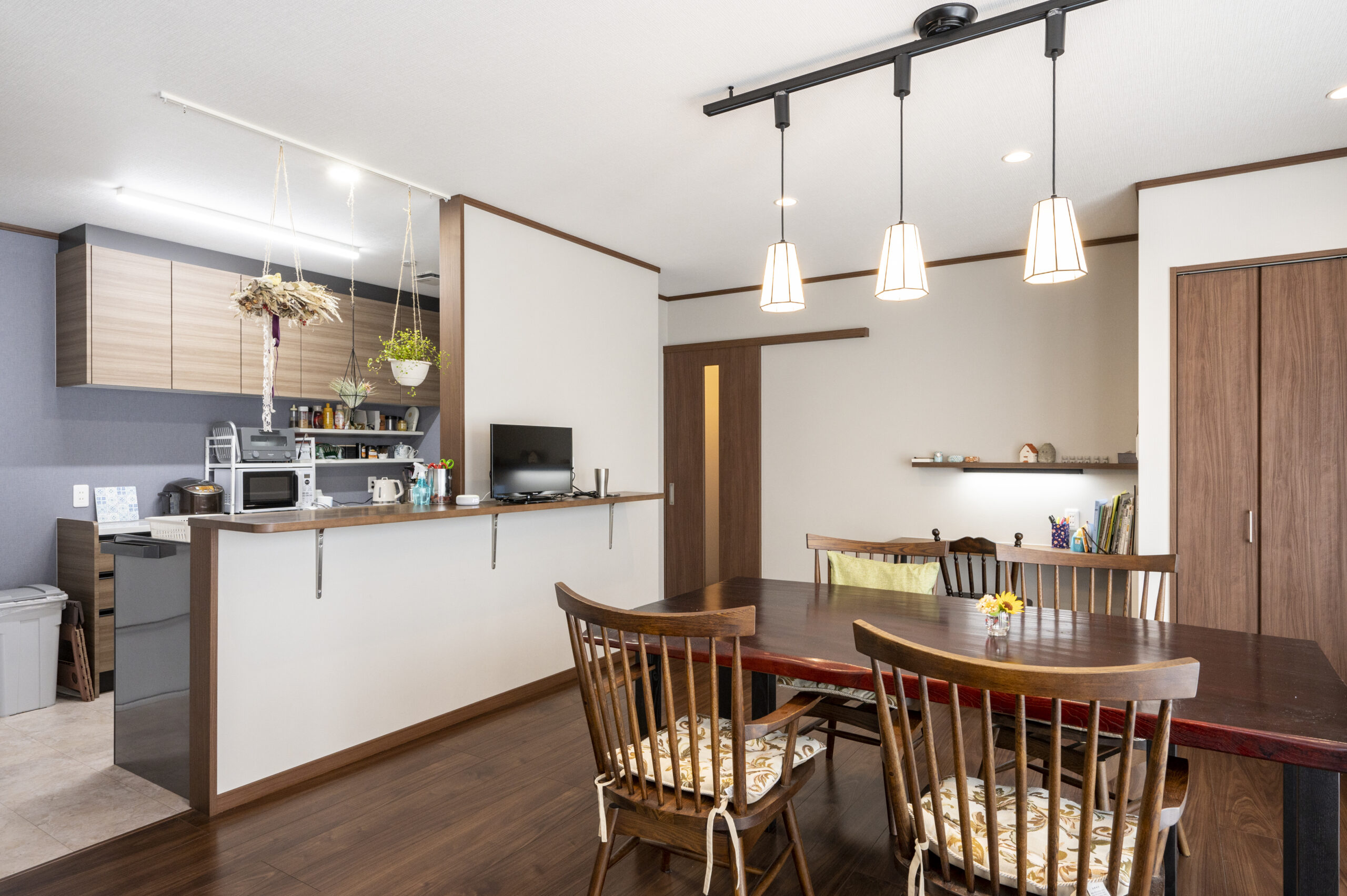 ダイニングテーブルに背を向けるカウンターは、天井照明だけでは影ができやすいため、手元の照明も必要です。施工時に照明を設置することも可能ですが、PCやタブレットなどを使うことも想定して、コンセントを設けておくのがおすすめです。