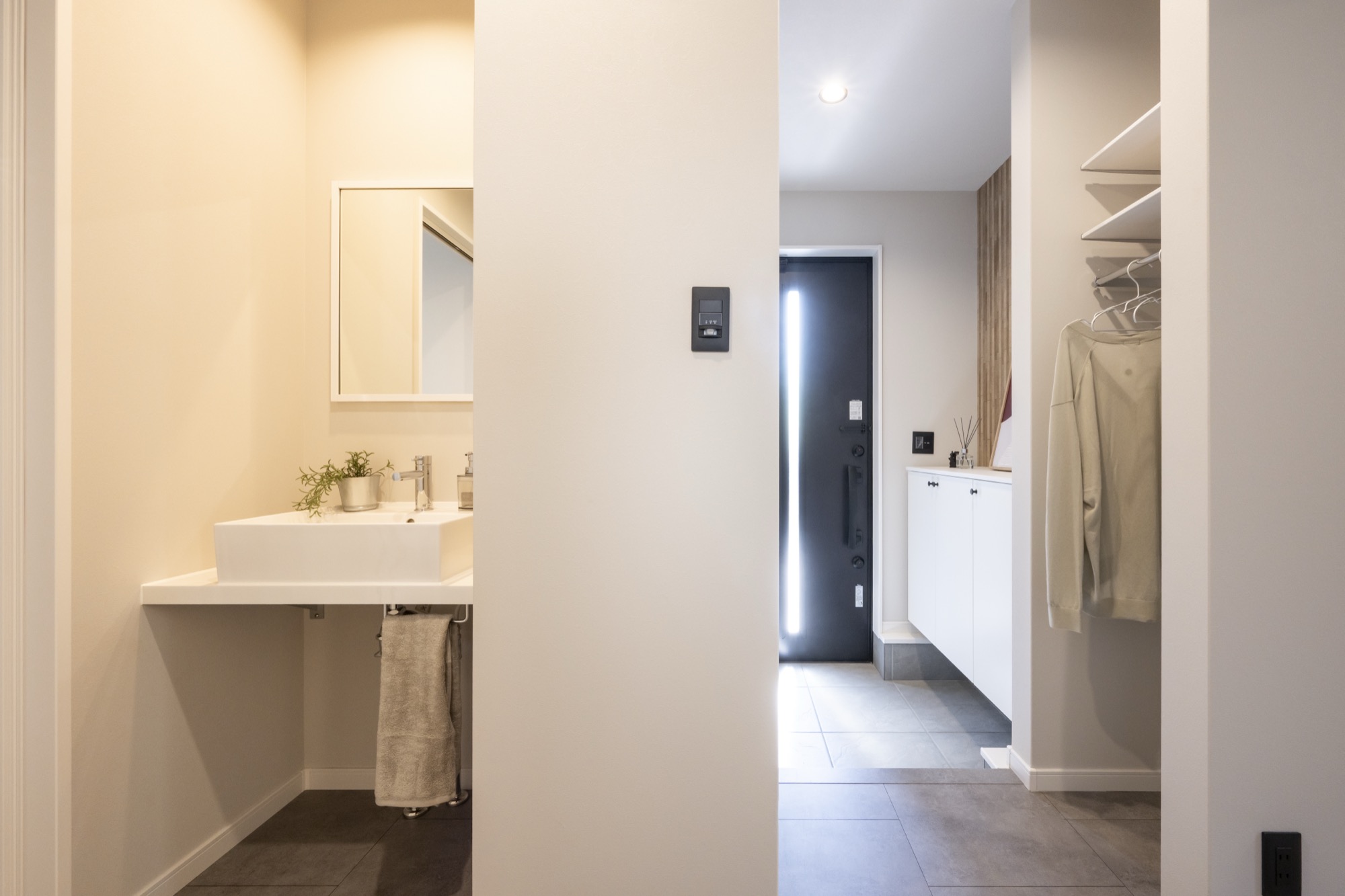 まず意識したいのが帰宅時の動線。玄関を入ってすぐの場所、シューズクロークのコート掛け玄関手洗いを設けることで、外から帰ったときの気持ちの切り替えがしやすくなります。くつろぐ空間に入る前のワンクッションは大切。帰宅後の動線上に、ファミリークロークなど着替えられる場所があるのもおすすめです。