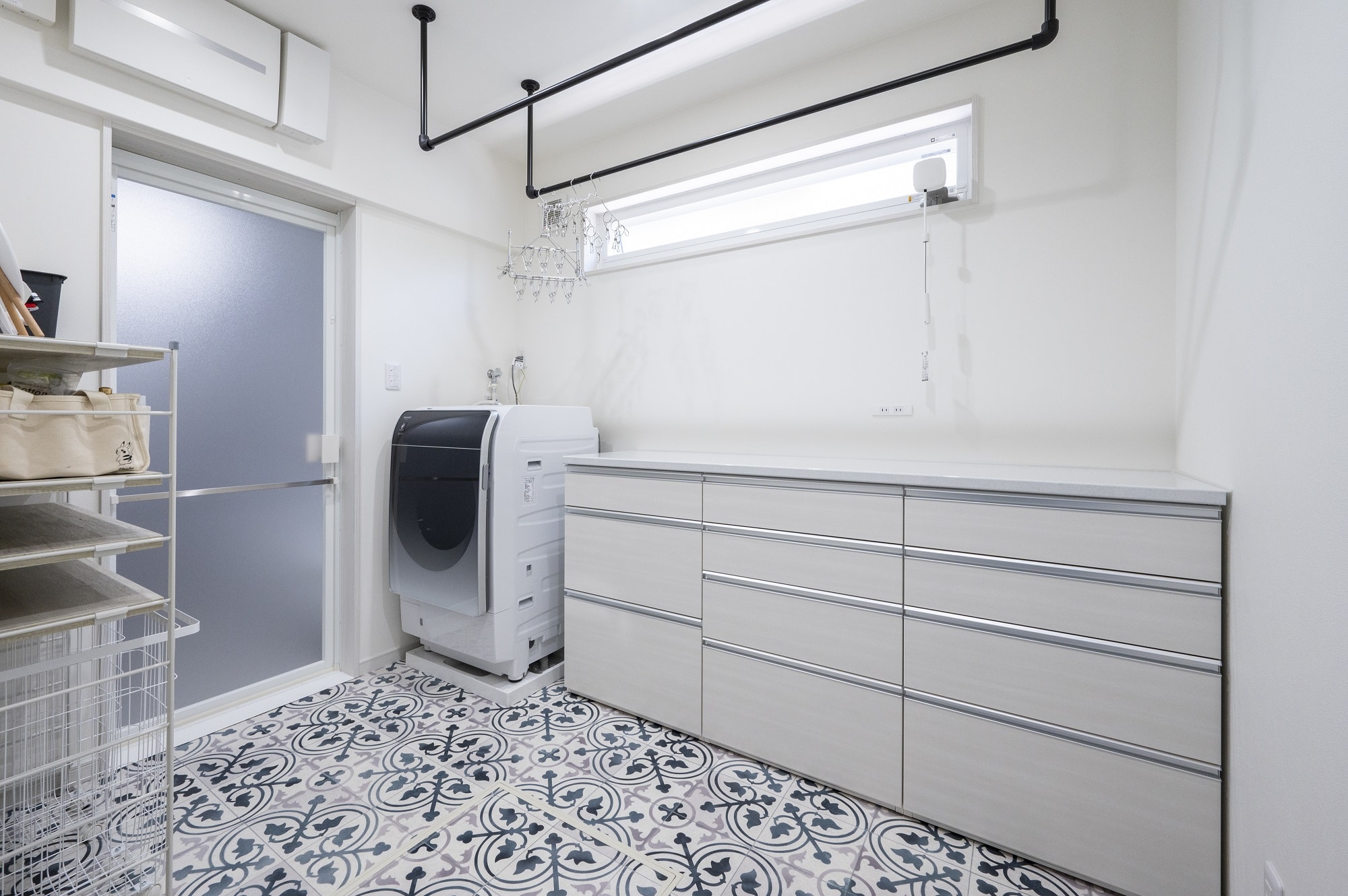 リビングと行き来できるランドリールームは、相当な広さを確保しているため大量の洗濯物でもストレスなく室内干しができます。収納スペースがたっぷりあるのもうれしいですね。