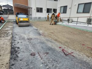 実は一度アスファルト舗装工事が完了しておりましたが雨が降ると水が溜まるとの指摘を受け補修工事をさせて頂きました。