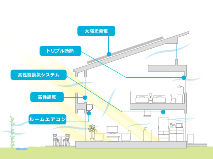 そして欠かせないのが断熱性能。一度暖めた空気が冷えにくいので、長時間同じ部屋にいても、じわじわとカラダが冷える感覚を抑えます。これら工夫の組み合わせにより季節問わずエアコン1台で、体調を守る暮らしを実現できます。