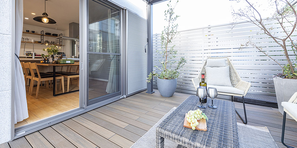 リビングから続くアウトドア空間にはおしゃれで快適なウッドデッキテラスも。
