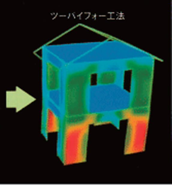ツーバイフォー工法の場合、火の通り道となる床や壁の内側において、枠組材などがファイヤーストップ材となって空気の流れを遮断し、上階へ火が燃え広がるのをくい止めます。