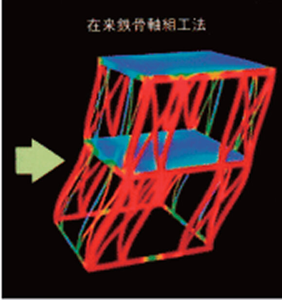 加えた力が柱や接合部などに集中。部分的に負担がかかりやすい構造であることが分かります。